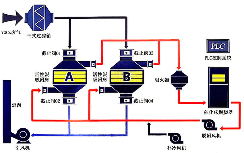活性炭吸附/脫附催化燃燒裝置可采用吸附—催化燃燒或吸附—熱力氧化兩種工藝。此法采用新型吸附材料(蜂窩狀活性炭)吸附,在接近飽和后引入熱空氣進行脫附、解析,脫附后廢氣引入催化燃